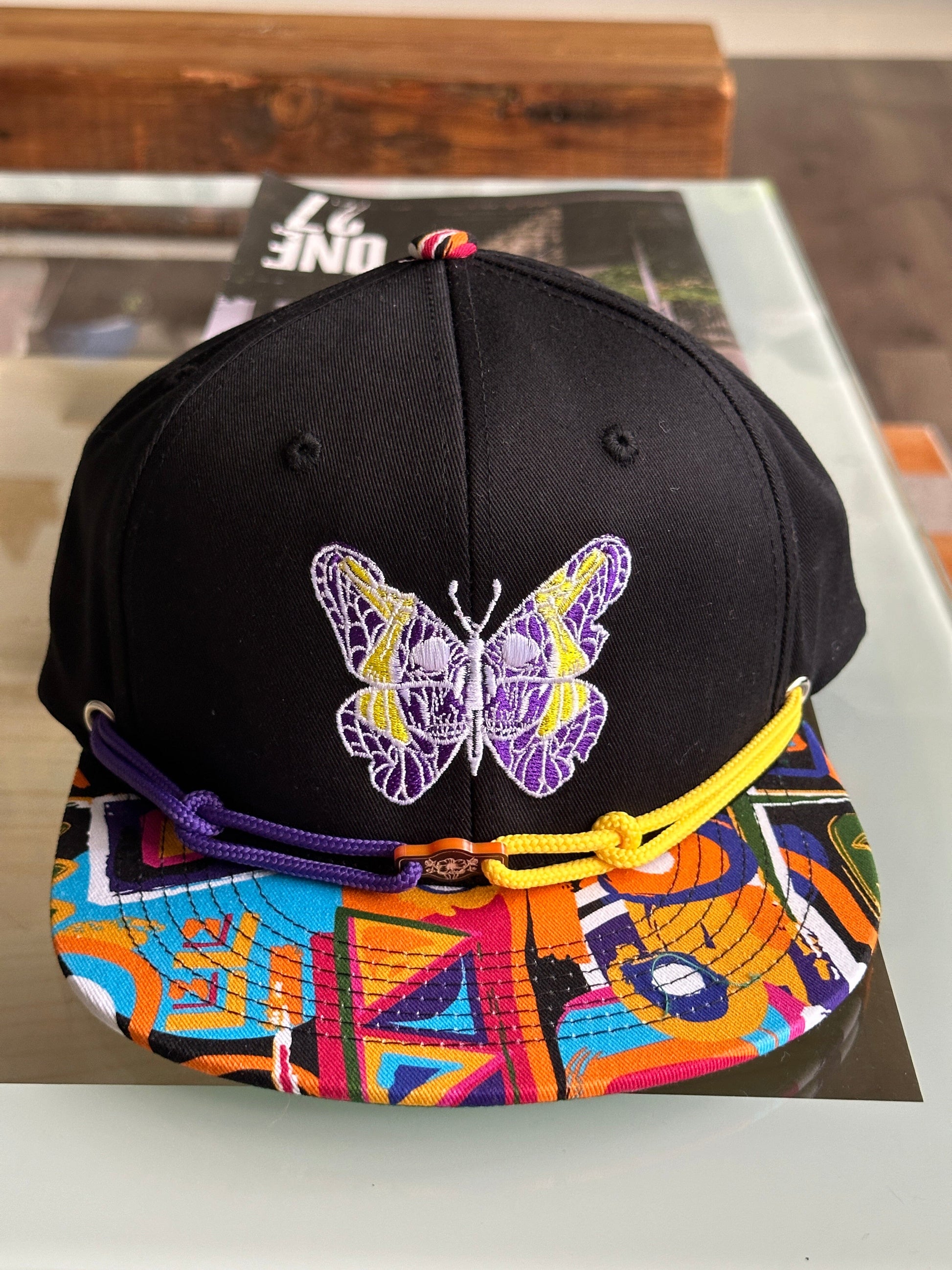 Black DP snap-back hat with retro sublimated brim and Findlay Skullerfly embroidery .