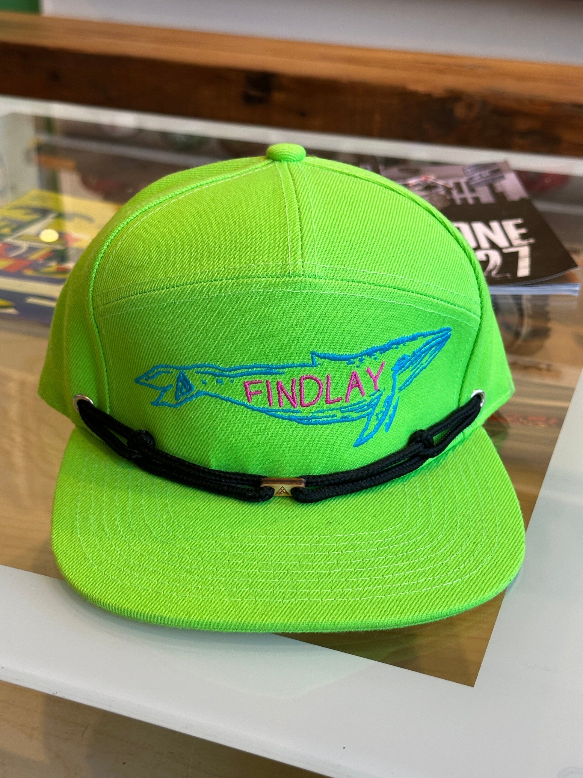 Lime green Crown 7 panel hat with Findlay Whale embroidery .