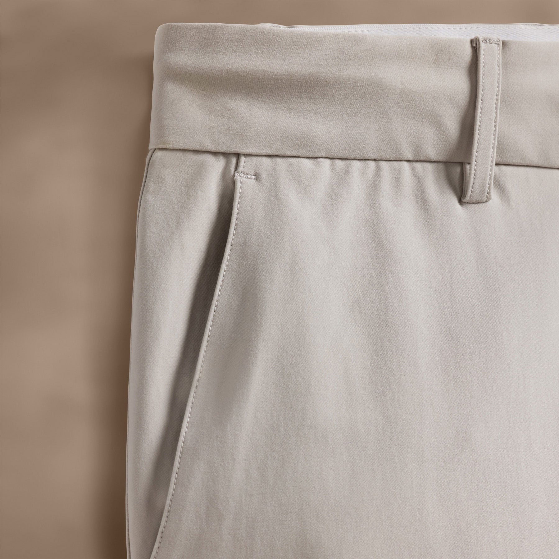 Our Golf Trouser is made in a high performance stretch cotton blend. Style details include a brushed elastic inside waistband with internal drawcord, belt loops, functional zip fly, side slash pockets, back welt pockets with button closure and side slits on bottom hems. Active fit.