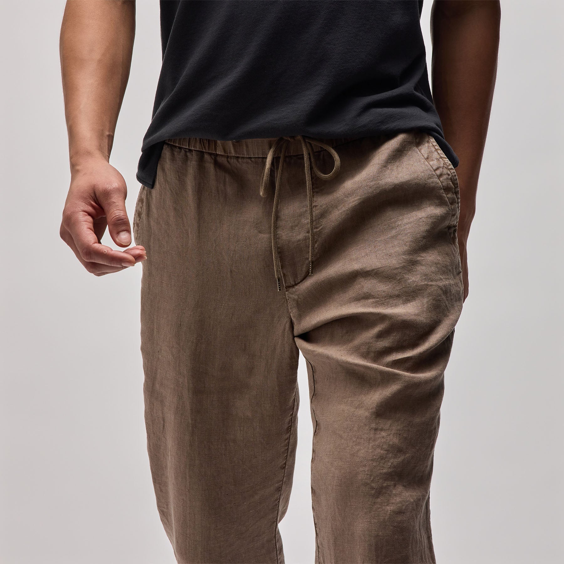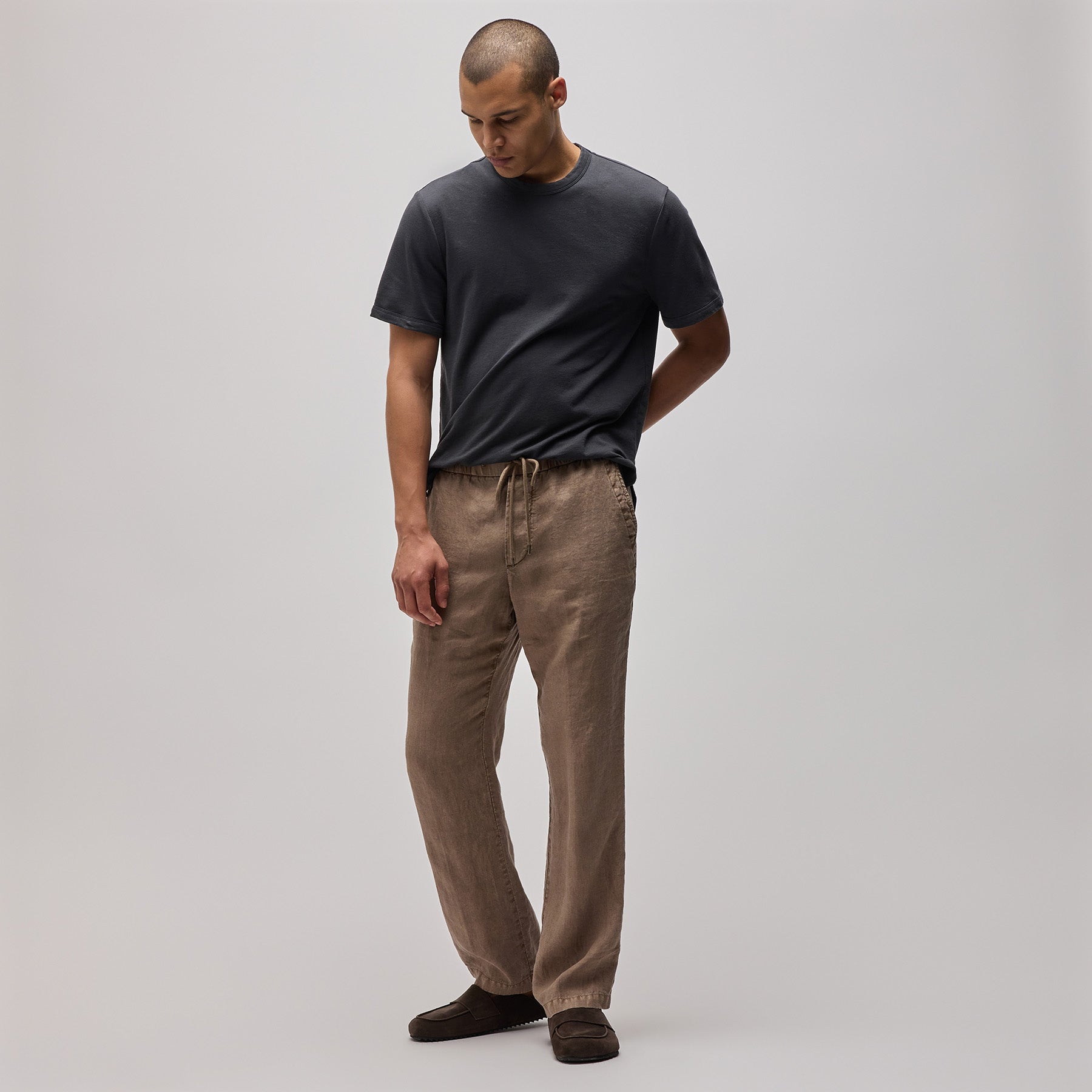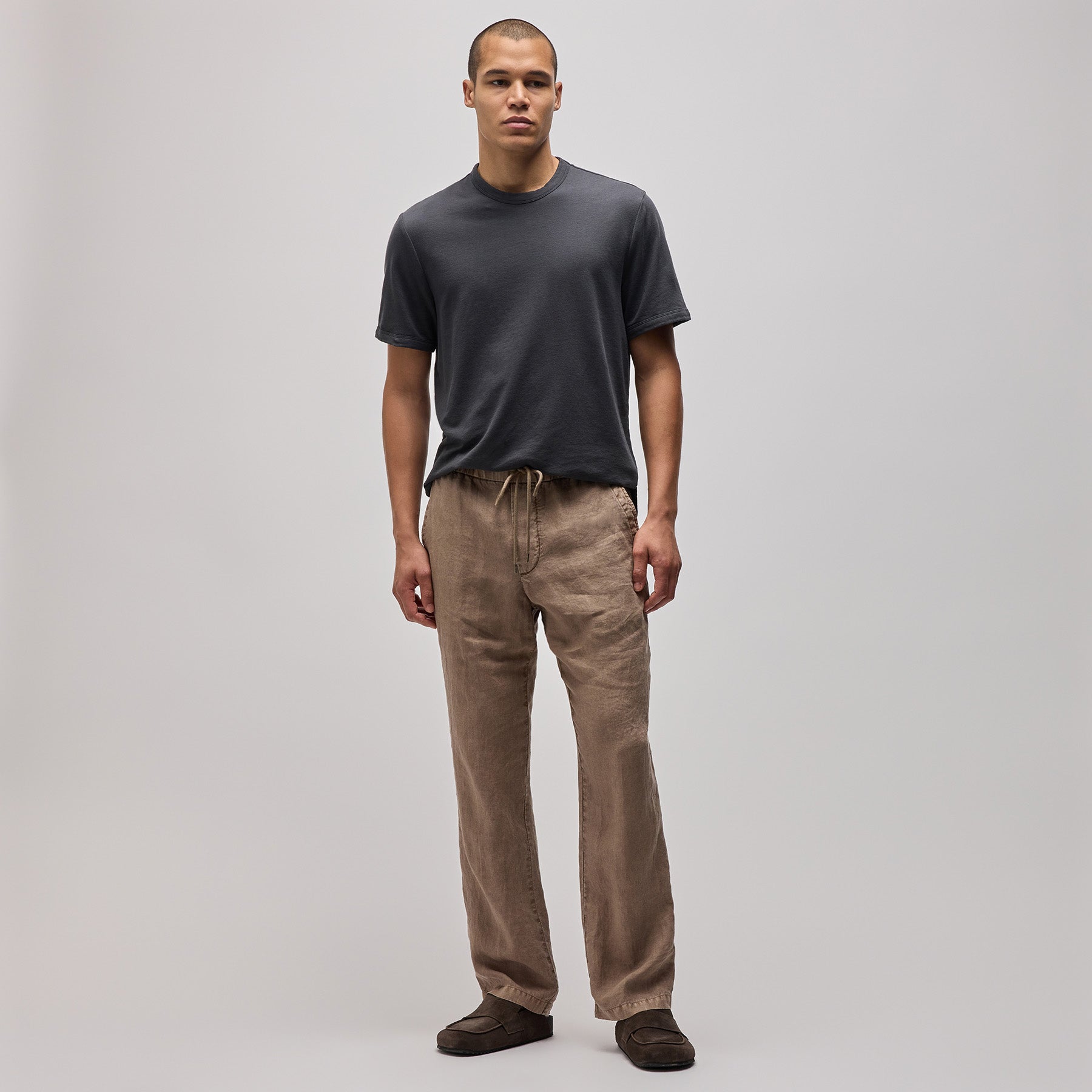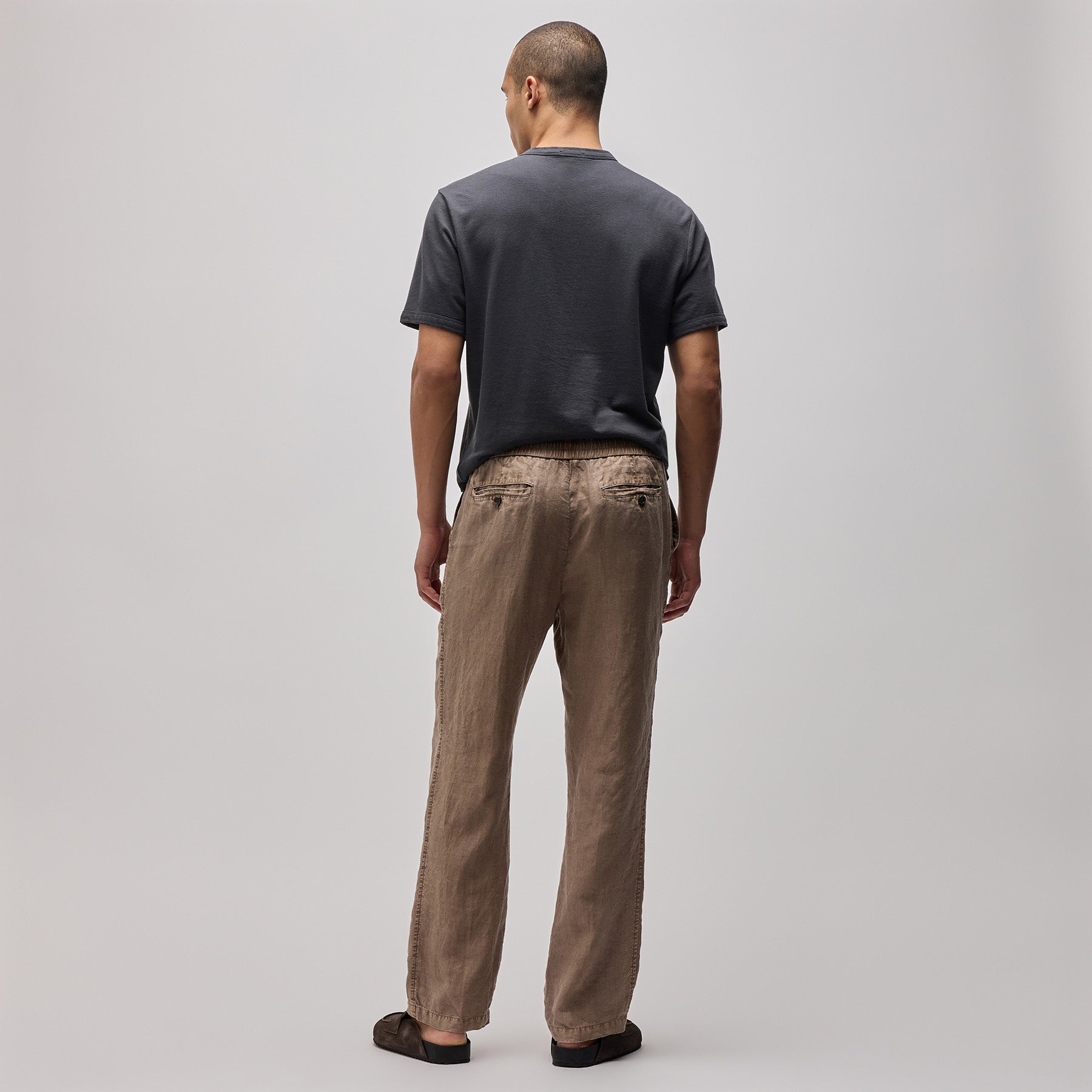 Our Relaxed Fit Linen Pant is made in a heavier version of our classic linen fabric. This fabric has visible slub texture and creates high's and low's when dyed. Style details include elasticized waistband with clean panel at center front and drawcord, slash front pockets, back welt pockets, non-functional fly, and clean bottom hems. Garment dyed. Relaxed fit.