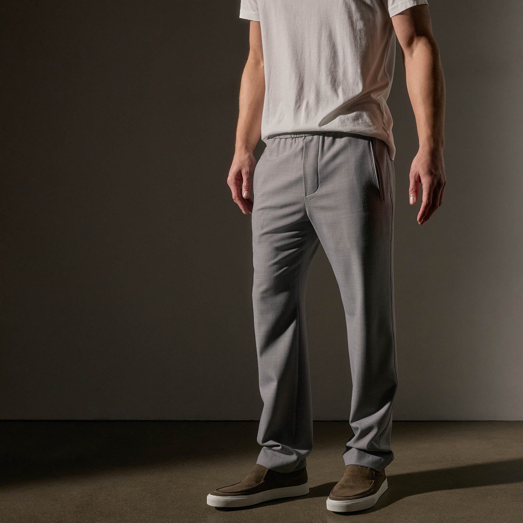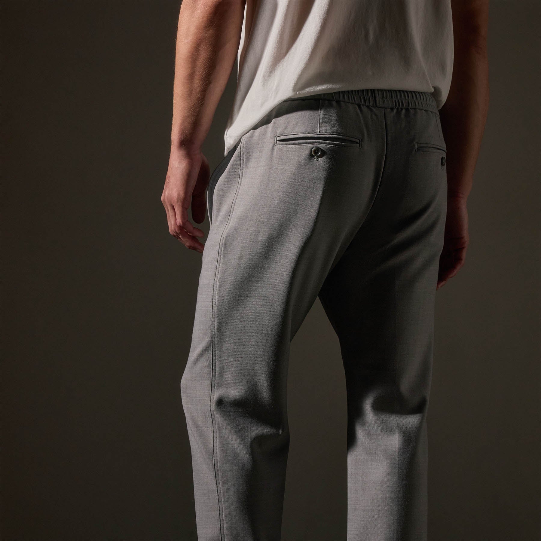 Our Wool Blend Trouser is crafted from premium Italian fabric with moisture-wicking properties. Designed for versatility, this trouser offers a polished, elevated look with the ease of added stretch for all-day wearability. Details include an elasticized waistband with an internal drawcord for a custom fit, a clean non-functional fly, and both front and back double welt pockets. Finished with a sleek hem, these trousers offer a classic fit